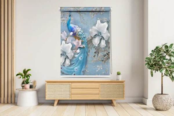 Bring refined elegance and serene beauty to your interiors with this exquisitely designed Roller Blind featuring a graceful blue peacock nestled among delicate white magnolia blooms. Set against a textured pastel blue backdrop with subtle floral detailing, the artwork creates a calm yet luxurious visual statement.