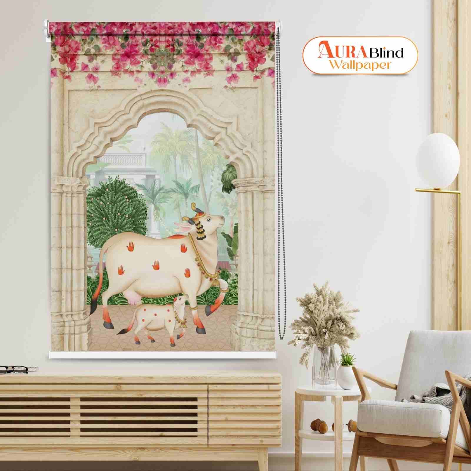Bring an aura of divine peace and artistic grace to your Home with this Calf in Archway and Kamadhenu Cow Pichwai Roller Blind for Pooja Room, a perfect fusion of spirituality, tradition, and elegance. The Mandir Roller Blind design is inspired by classic Indian Pichwai art Design. This exquisite Window Blind portrays the revered Gau Mata (Holy Cow) and her calf, adorned with sacred handprints and delicate jewelry, standing within a majestic stone archway that opens to a serene garden and palace view. The design is enhanced by a vibrant floral border of pink and magenta bougainvillea, adding a touch of natural beauty and color harmony. More than just a window covering, this piece doubles as cultural wall art, bringing warmth and devotion to any space. This is an ideal Roller Blind for Mandir or Temple, Prayer Room, Living Rooms, Hall, Bedrooms, or meditation areas.