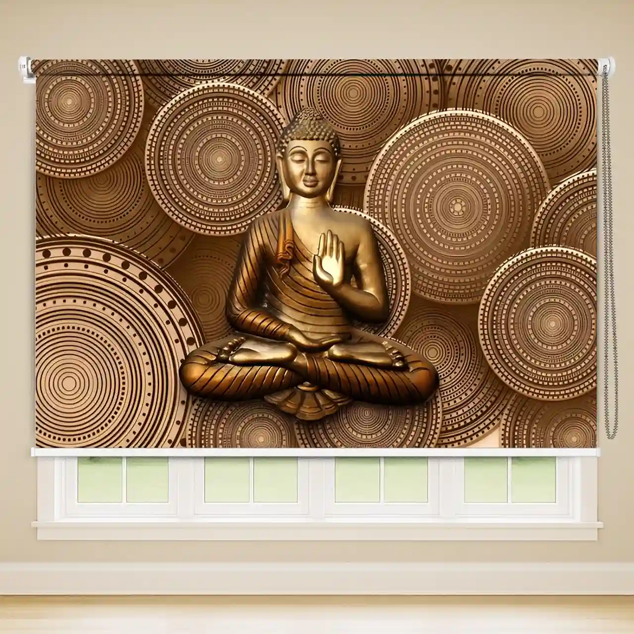 Invite peace, balance, and spiritual harmony into your space with our Sacred Buddha Mandala Roller Blind. Featuring a serene golden Buddha seated in a meditative posture, this design is surrounded by intricate concentric mandala patterns symbolizing unity, mindfulness, and inner awakening. The warm bronze and gold tones create a calming yet powerful visual presence, making it an ideal centerpiece for tranquil interiors.