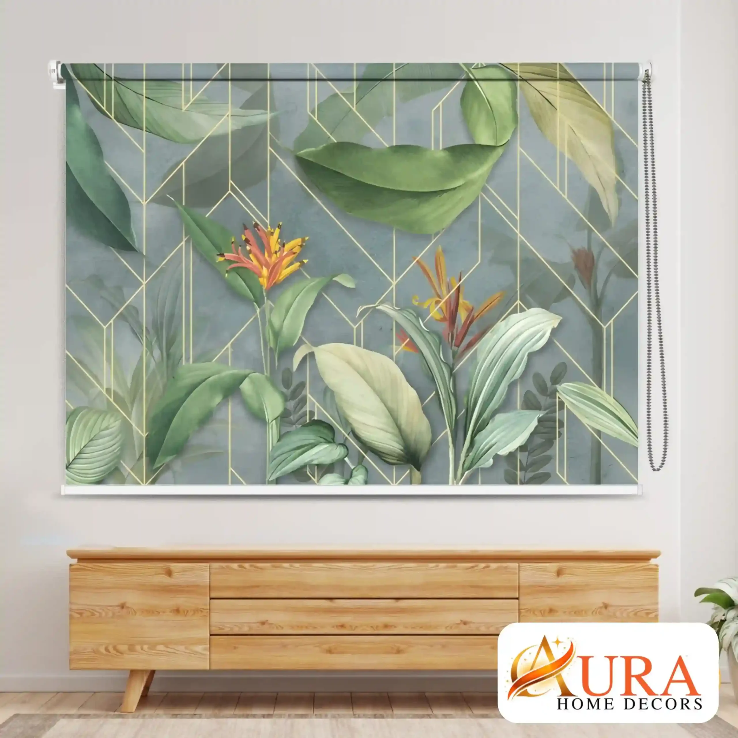 This Tropical Leaf Pattern Window Roller Blind for Living Room adds nature-inspired beauty to your space, with luscious tropical leaves placed over a soft, muted background and polished gold geometric line design. This Roller Blind is designed to enrich modern rooms by striking the perfect combination of decorative style and everyday usefulness. The soothing green tones and botanical artwork make it ideal for living rooms, bedrooms, and creative settings that require light control without losing aesthetics.